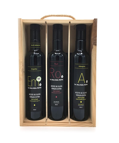Pack de 3 botellas de 250 ml presentado en caja de madera. Podrás degustar aceite Empeltre, Royal y Arberquino.